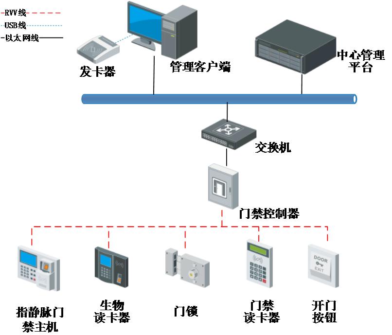 门禁读卡器、生物识别读卡器、开门按钮、磁力锁等前端门禁设备通过RVV4*0.75/ RVV2*0.75线缆接入到网络门禁控制器上,而网络门禁控制器通过非屏蔽双绞线接入交换机经局域网集成到安防综合管理平台上。